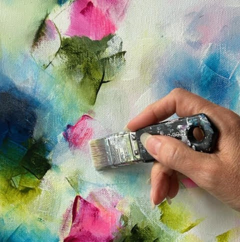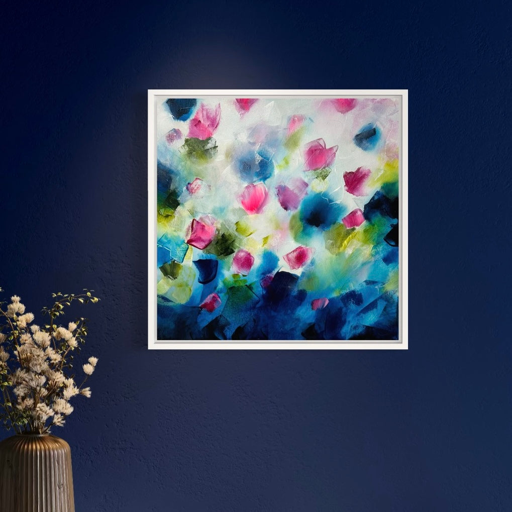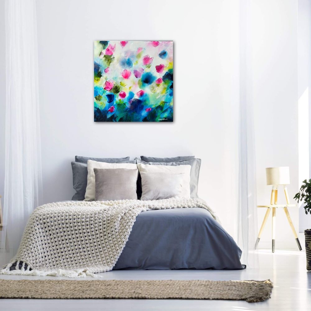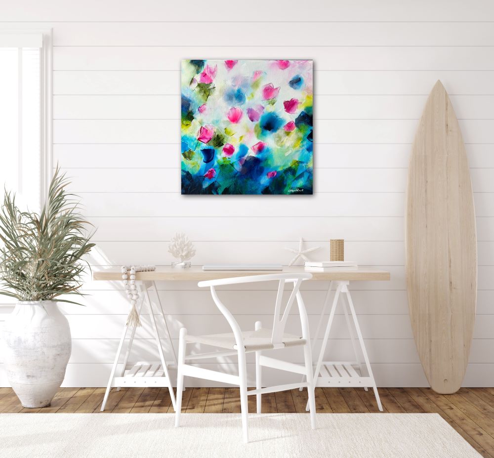 This fresh floral original painting 'And they dreamt of summer', is just dreamy! It's exciting vibrant colour scheme with bursts of blues, pinks, greens and whites will uplift your spirits and add a gorgeous, vibrant touch to any room. With an abstract contemporary twist this painting it inspired by the thought of summer, the scent of the roses swaying gently with that sweet aroma that softly drifts past your nose on the summer breeze.