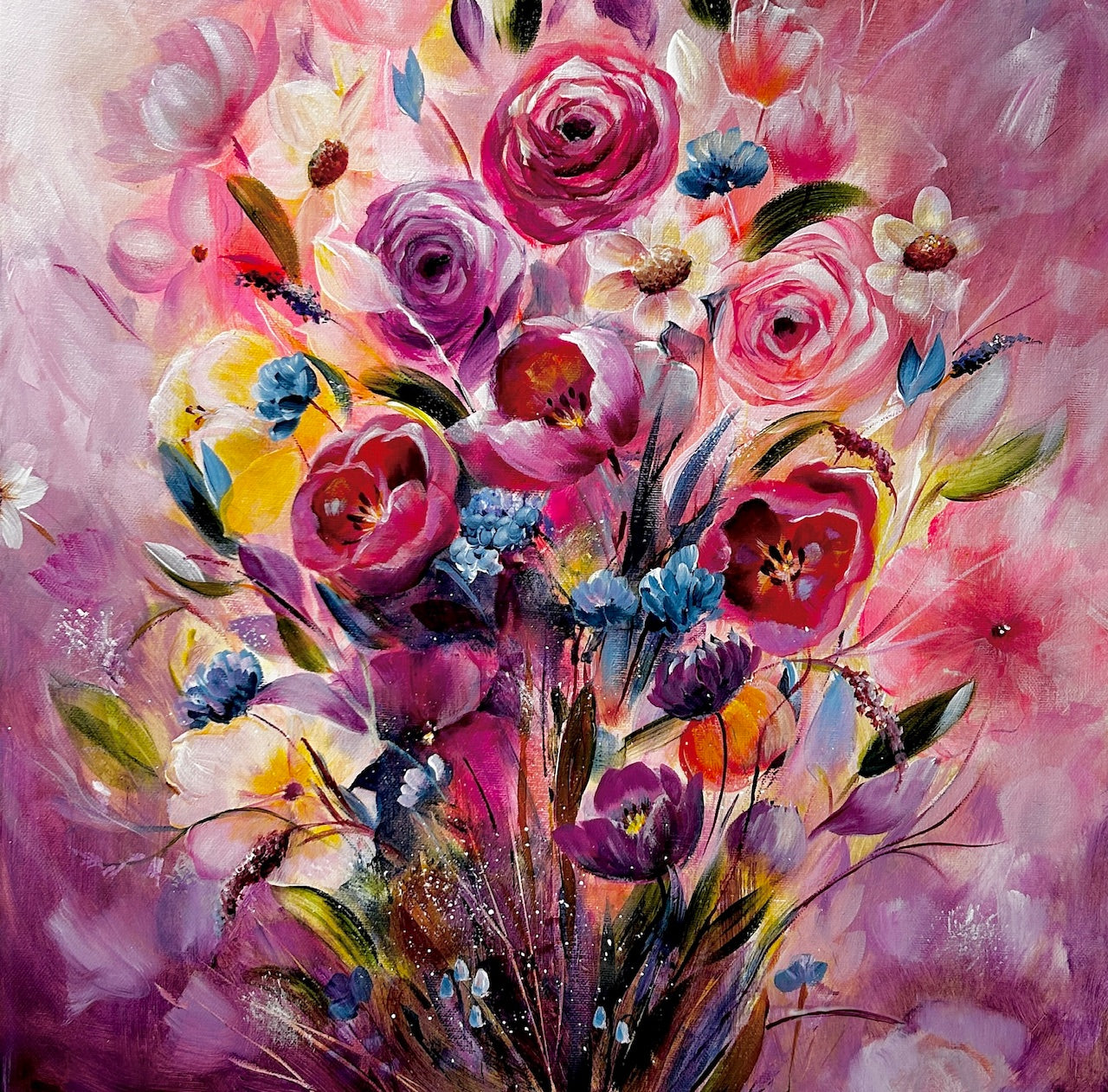 This gorgeous original painting, 'Burst Of Blooms' is full of energy and life! It's exciting vibrant colour scheme of peaches, pinks, violets and lavenders will uplift your spirits and add a stunning touch to any room.