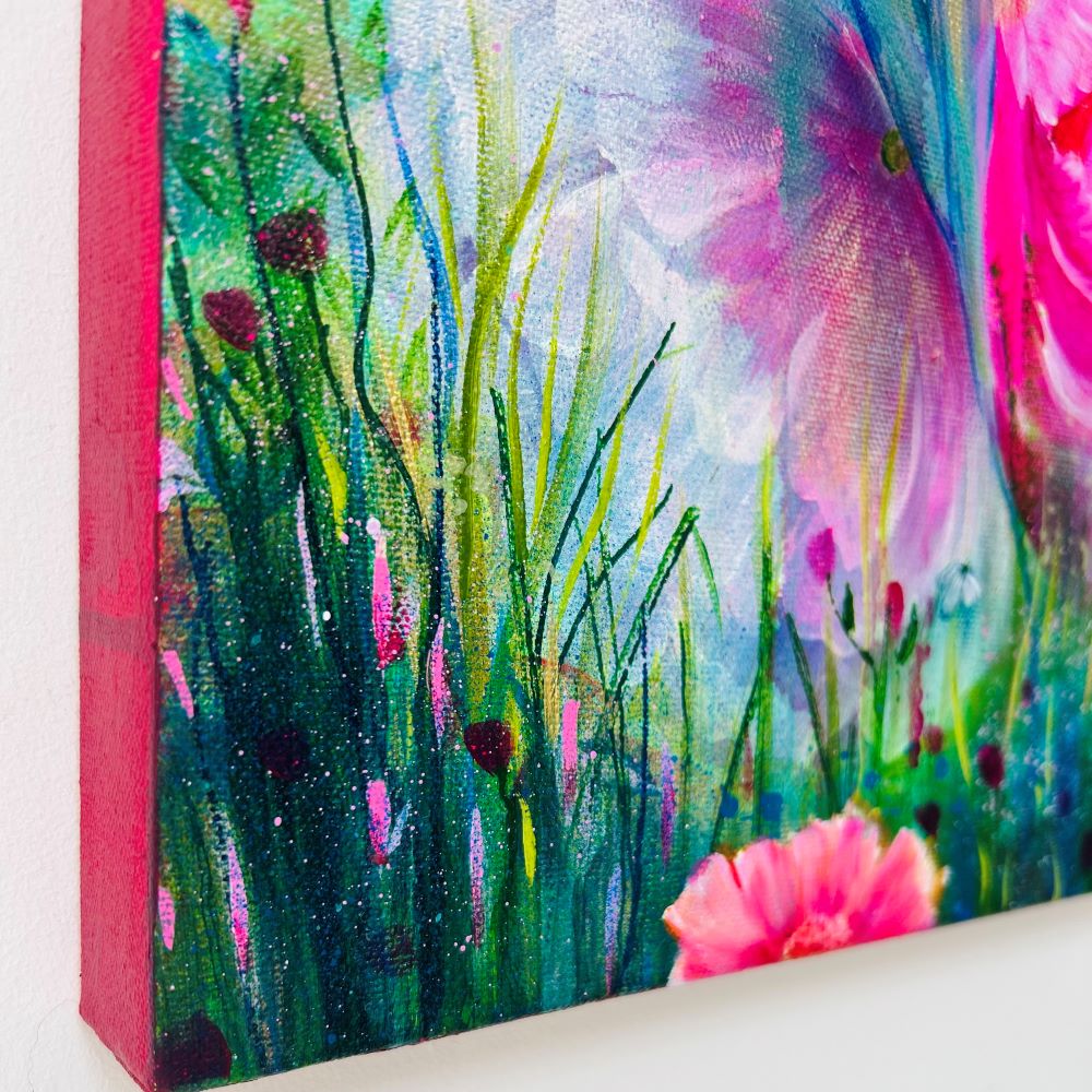 'Devotion'. This painting is an Ode to love, loyalty and inner strength. The vibrant pink blooms pulse with emotion. Tender, yet powerful, alive with joy and passion. The lush, rich greens, ground the piece with renewal and balance. A celebration of heart felt connection and the beauty found in unwavering strength.