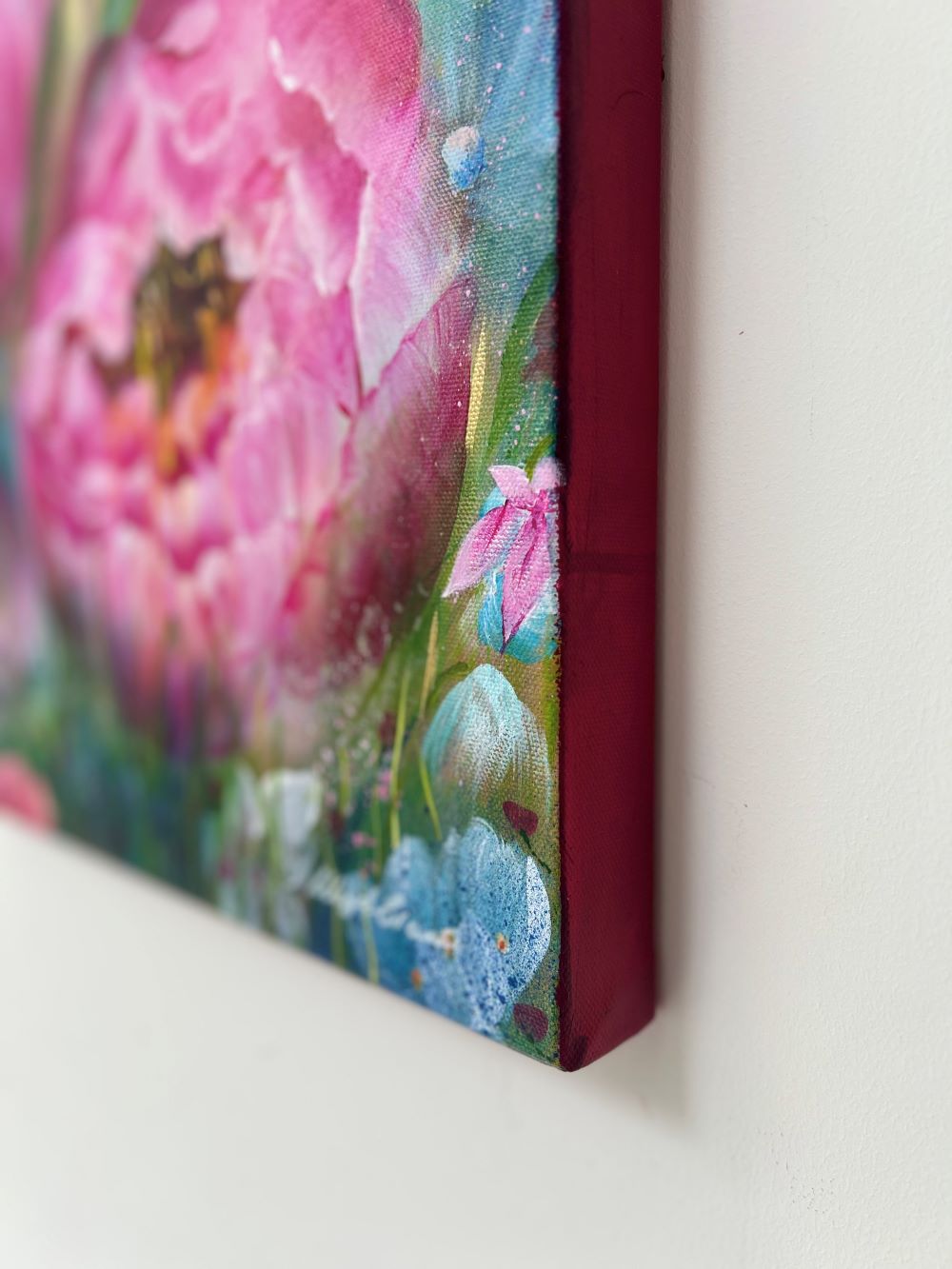 With confident floral blooms bursting off the canvas, its a celebration of nature's beauty and resilience, with its rich pinks, blues and fresh greens.