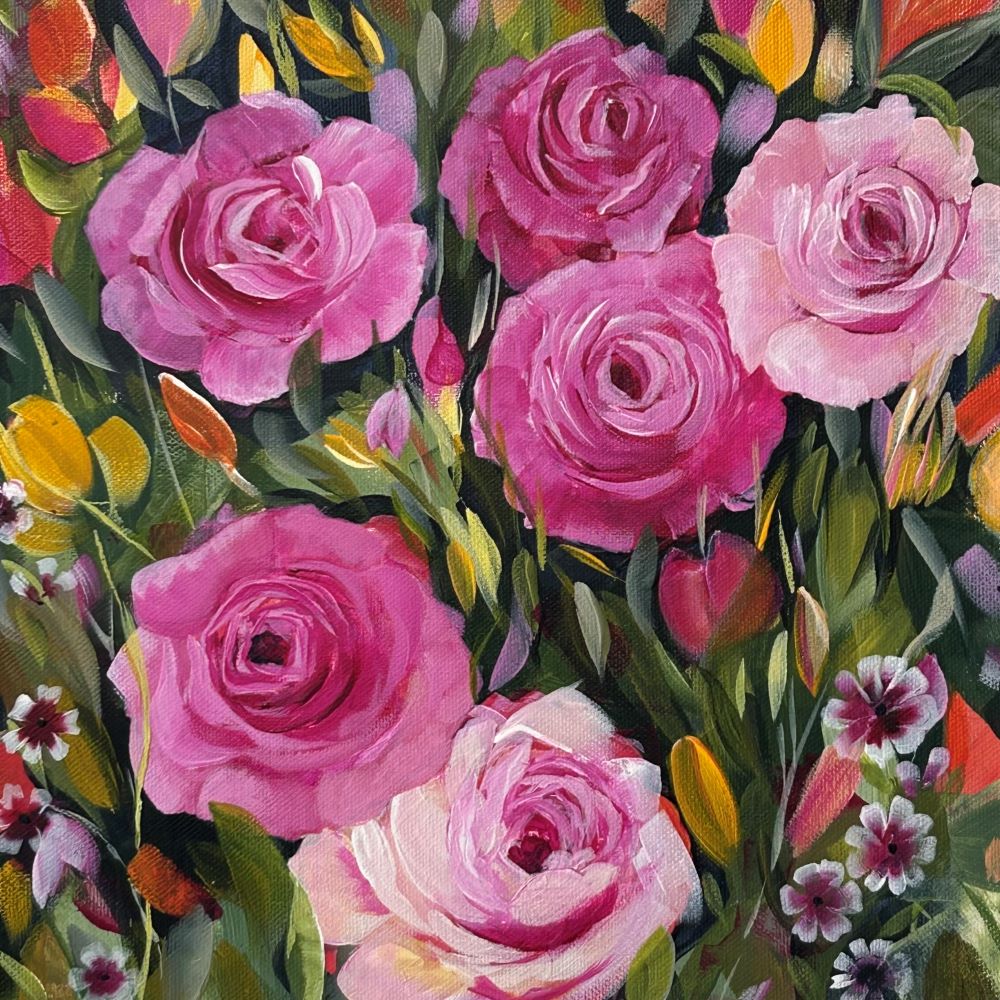 It's vibrant colour scheme of pale pink and deep magenta roses nestled within the green foliage gives a natural, wild feel to the painting with touches of yellow peeping through the vibrant green and little gems proudly poking through the greenery heading to the sun. It gives a relaxed feel and lets the natural beauty of flowers shine through. You can almost smell the exquisite rose scent when you look at it!